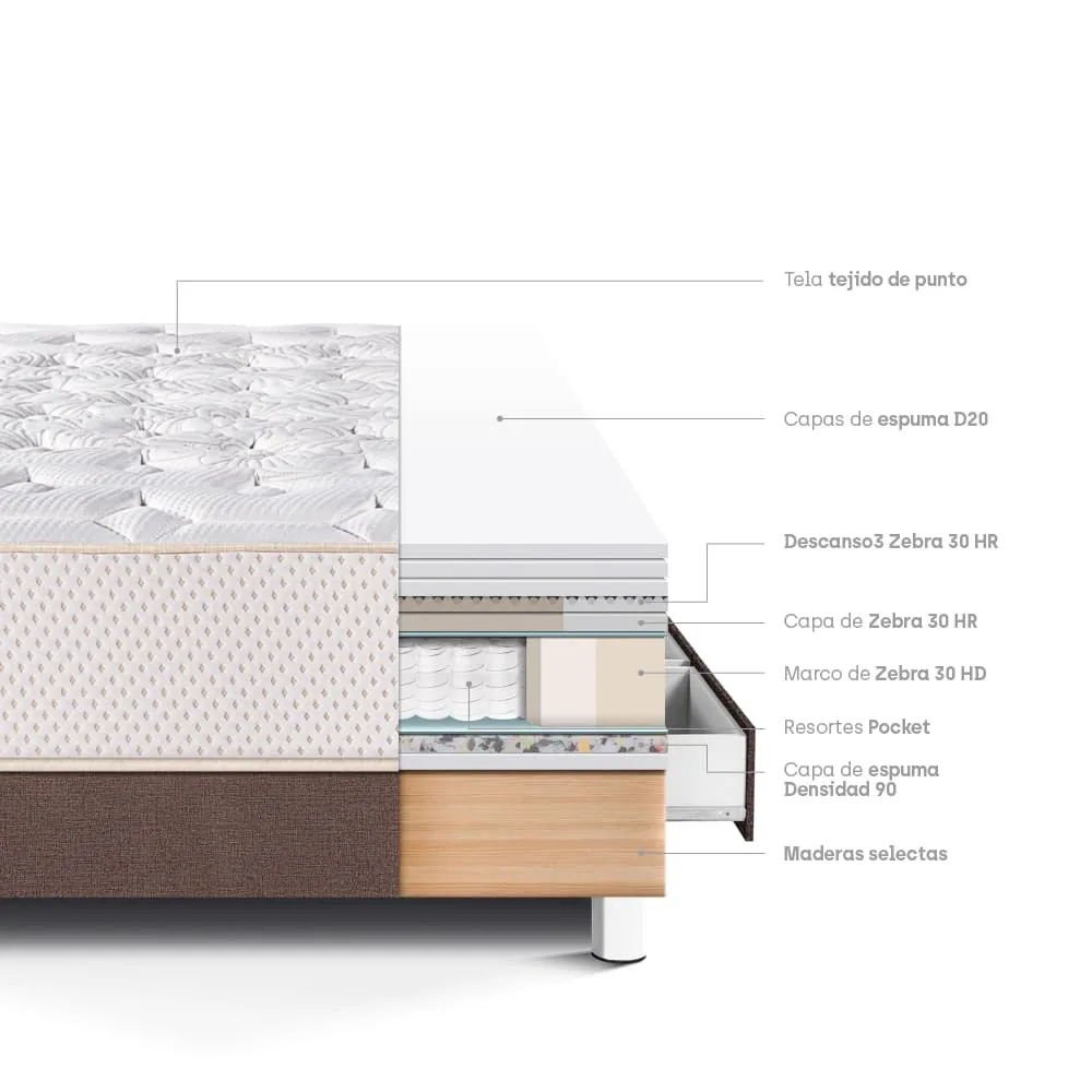 Su tecnología desarrollada y testeada en Paraíso combina de forma inteligente capas de espuma Zebra de alta resiliencia para ofrecer soporte y una exquisita sensación de confort.