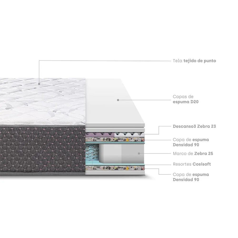 Colchón con tecnología de resortes Cosisoft que ofrece una mayor estabilidad y buen soporte durante el descanso.